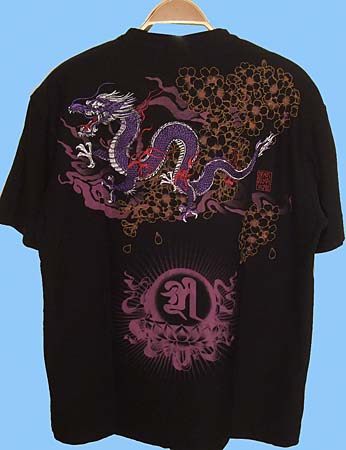 【マサのコメント】絡繰魂(からくり魂)の龍神・梵字柄が登場しました。生地は綿100%。今回は高貴な紫色の『龍神』柄だよ。バックや前左下に紫色の『龍神』が刺しゅうやプリント使いでかっこいいよ。またバック下方にも紫色の梵字柄のプリント使い。カラーはブラックとホワイト。サイズはXXL寸。